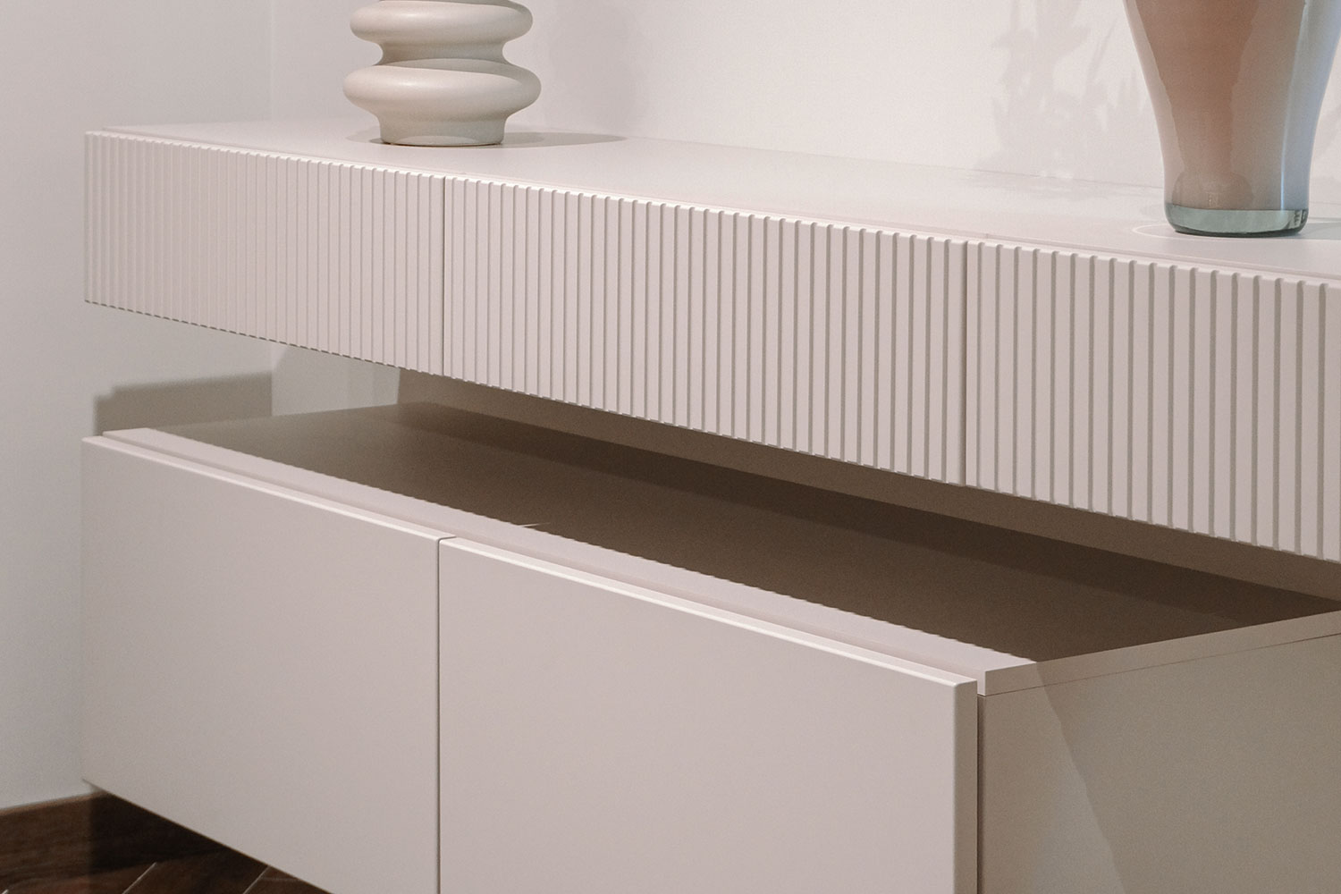 - Ящики с направляющими Quadro Hettich со встроенным механизмом и открыванием ящика нажатием на фасад — Push to open. Для срабатывания механизма между корпусом тумбы и фасадом предусмотрен зазор не менее 4 мм.